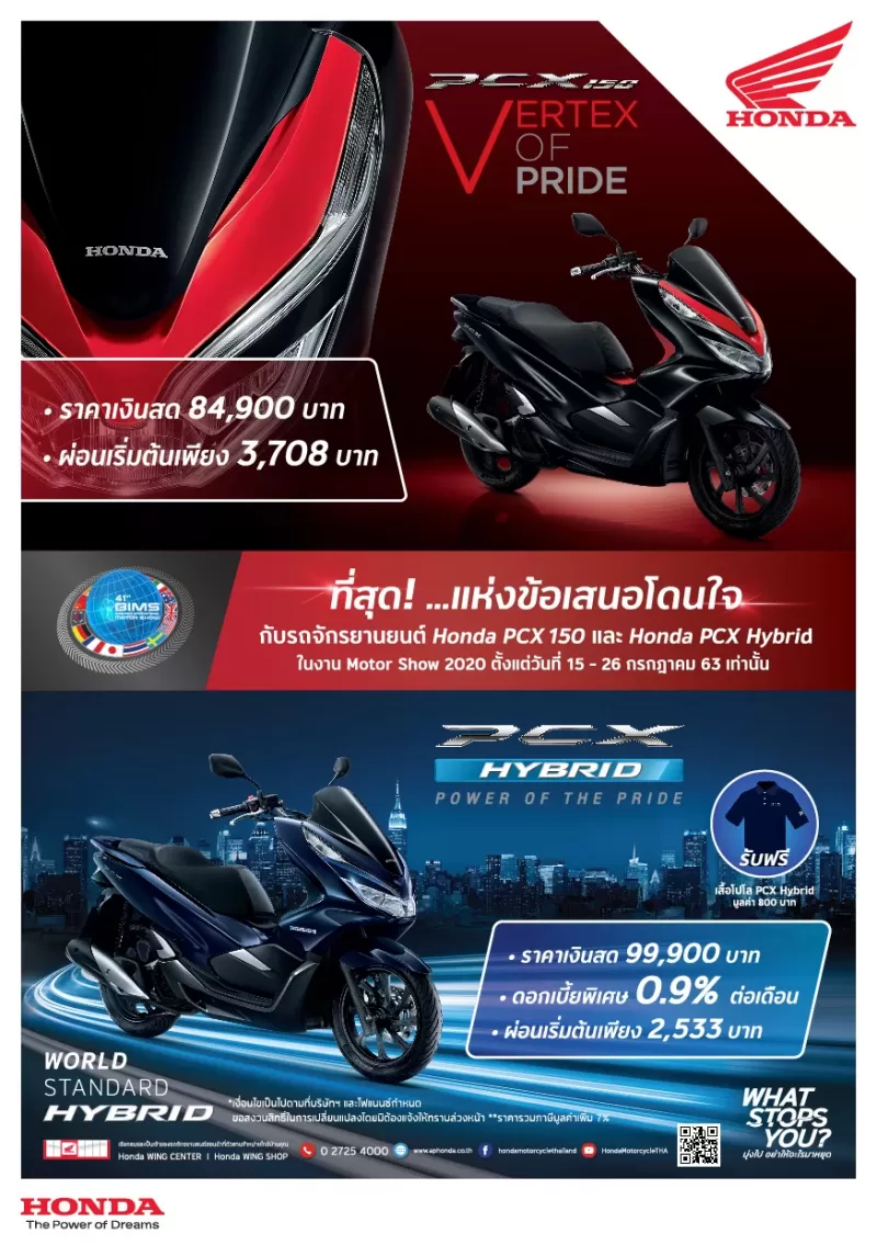 • Honda PCX Hybrid ราคาเงินสดเหลือเพียง 99,900 บาท พร้อมรับฟรี! เสื้อโปโล PCX Hybrid สุดเท่แบบ Limited Edition (มูลค่า 800 บาท) ทั้งแบบซื้อเงินสดและผ่อน