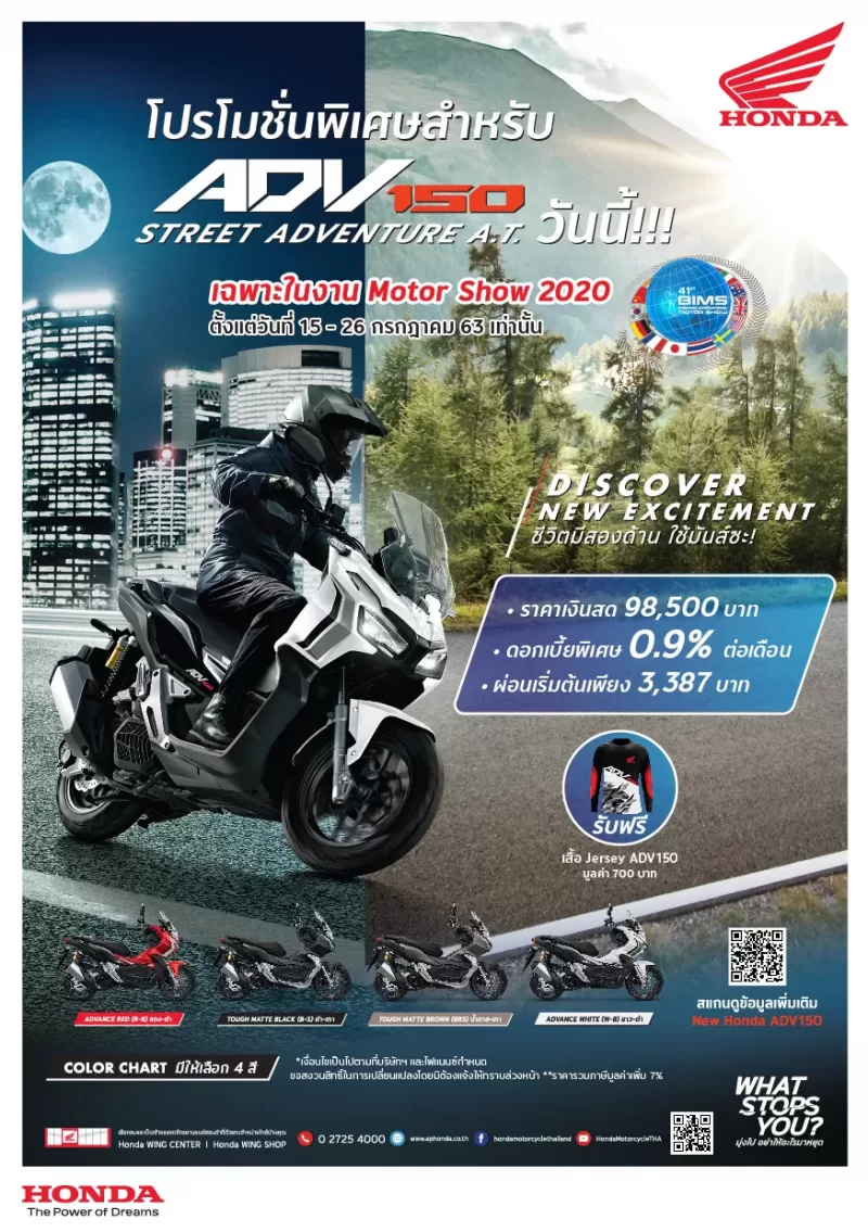 • Honda ADV150 ราคาเงินสดเหลือเพียง 98,500 บาท พร้อมรับฟรี! เสื้อ Jersey ADV150 สุดเท่แบบ Limited Edition (มูลค่า 700 บาท) ทั้งแบบซื้อเงินสดและผ่อน